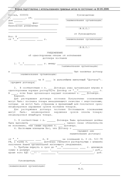Уведомление об одностороннем отказе от исполнения Договора поставки