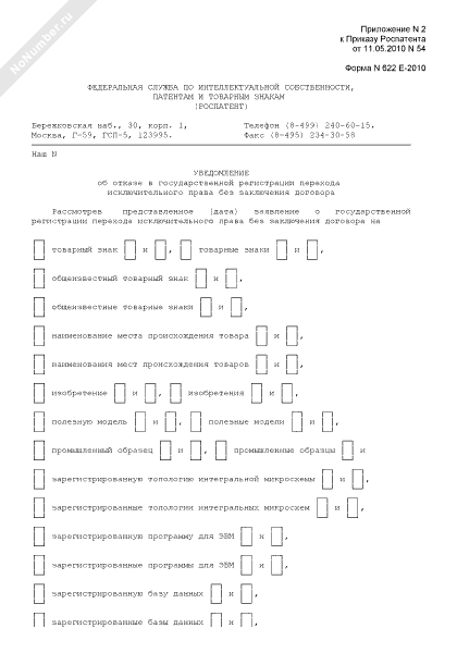 Уведомление об отказе в государственной регистрации перехода исключительного права без заключения договора. Форма № 622 Е-2010 (рекомендуемый образец заполнения)