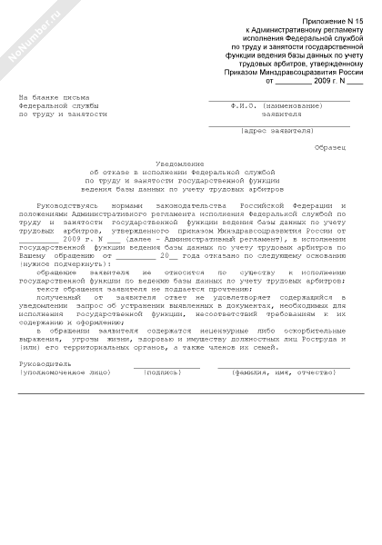 Уведомление об отказе в исполнении Федеральной службой по труду и занятости государственной функции ведения базы данных по учету трудовых арбитров (рекомендуемый образец заполнения)