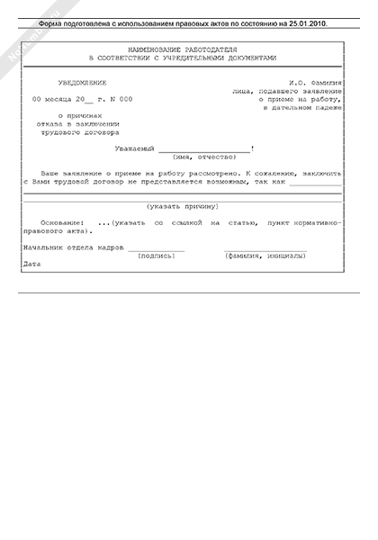 Уведомление соискателя о причинах отказа в заключении трудового договора (рекомендуемый образец заполнения)