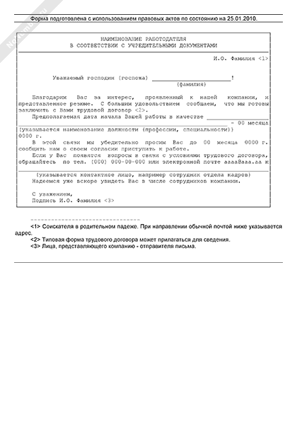Уведомление соискателя о заключении трудового договора (рекомендуемый образец заполнения)