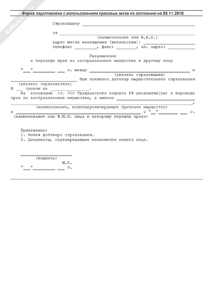 Уведомление страховщика о переходе прав на застрахованное имущество к другому лицу (рекомендуемый образец заполнения)
