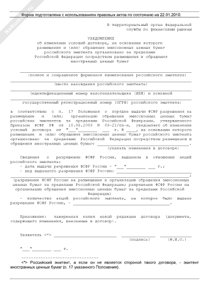 Уведомление в Федеральную службу по финансовым рынкам об изменении условий договора, на основании которого размещение и (или) обращение эмиссионных ценных бумаг российского эмитента организовано за пределами Российской Федерации посредством размещения и обращения иностранных ценных бумаг