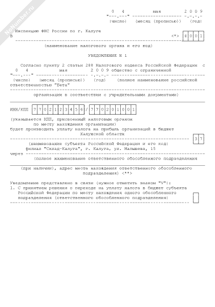 Уведомление в налоговый орган о выборе организацией обособленного подразделения, относящегося к этому налоговому органу, через которое будет производиться уплата налога на прибыль (рекомендуемый образец заполнения)
