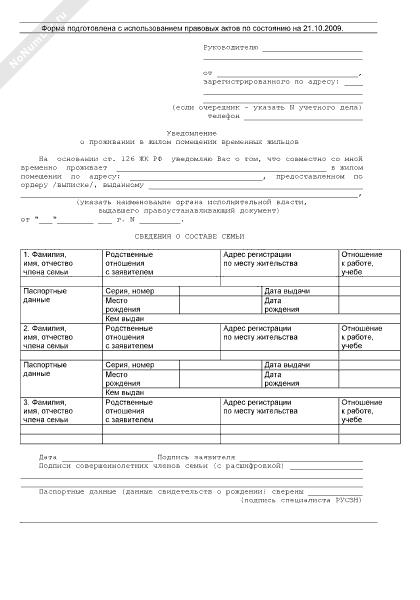 Уведомление в правлении жилищного кооператива о проживании в жилом помещении временных жильцов (рекомендуемый образец заполнения)
