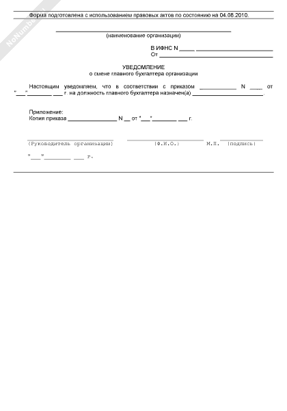 Уведомление в налоговый орган о смене главного бухгалтера организации