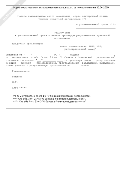 Уведомление в уполномоченный орган о начале процедуры реорганизации кредитной организации (рекомендуемый образец заполнения)