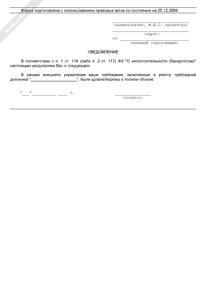 Уведомление внешним управляющим кредитора должника об удовлетворении его требований (рекомендуемый образец заполнения)