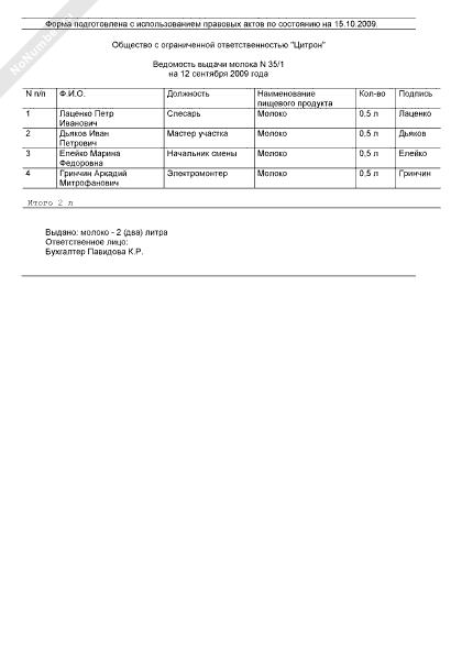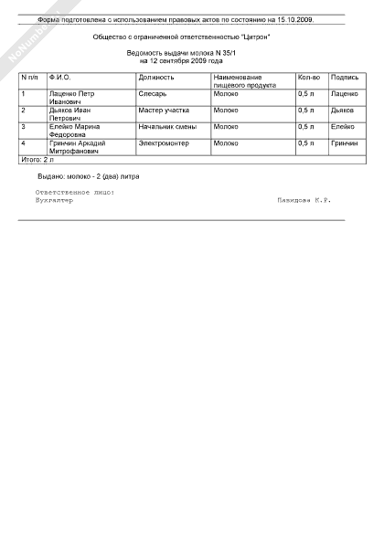 - 25Ведомость бесплатной выдачи молока и других равноценных пищевых продуктов лицам, занятым в организации на работах с вредными условиями труда