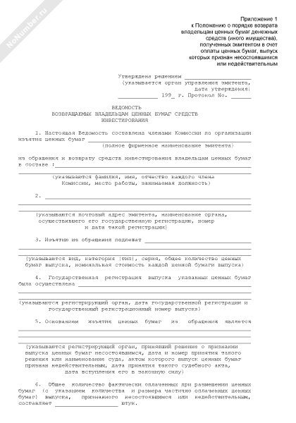 - 30Ведомость возвращаемых владельцам ценных бумаг средств инвестирования (приложение к положению о порядке возврата владельцам ценных бумаг денежных средств (иного имущества), полученных эмитентом в счет оплаты ценных бумаг, выпуск которых признан несостоявшимся или недействительным)
