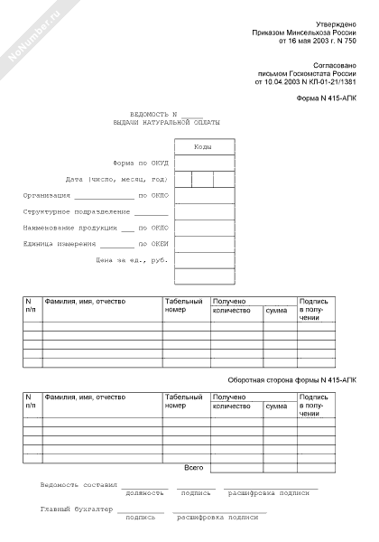 - 36Ведомость выдачи натуральной оплаты. Форма № 415-АПК