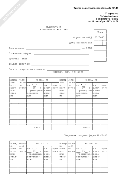 - 28Ведомость взвешивания животных (типовая межотраслевая форма № СП-43)