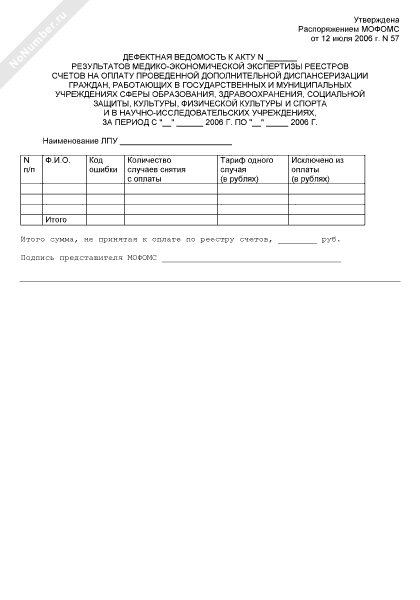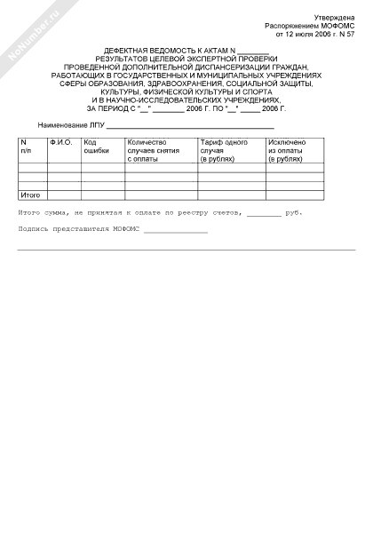 - 396Дефектная ведомость к акту результатов медико-экономической экспертизы реестров счетов на оплату проведенной дополнительной диспансеризации граждан, работающих в государственных и муниципальных учреждениях сферы образования, здравоохранения, социальной защиты, культуры, физической культуры и спорта и в научно-исследовательских учреждениях