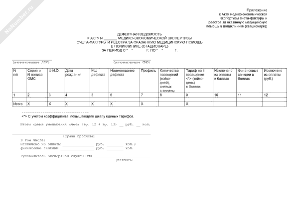 - 394Дефектная ведомость (приложение к акту медико-экономической экспертизы счета-фактуры и реестра за оказанную медицинскую помощь в поликлинике (стационаре) в соответствии с условиями договоров на предоставление лечебно-профилактической помощи (медицинских услуг) по обязательному медицинскому страхованию)