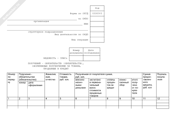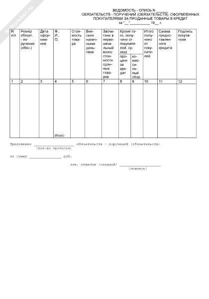 - 383Ведомость-опись обязательств-поручений (обязательств), оформленных покупателями за проданные товары в кредит. Специализированная форма № 9-ТКр