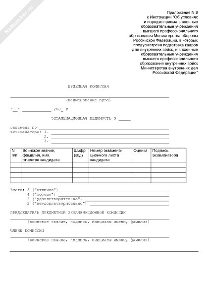 Экзаменационная ведомость поступающих в военно-учебное заведение (рекомендуемый образец заполнения)
