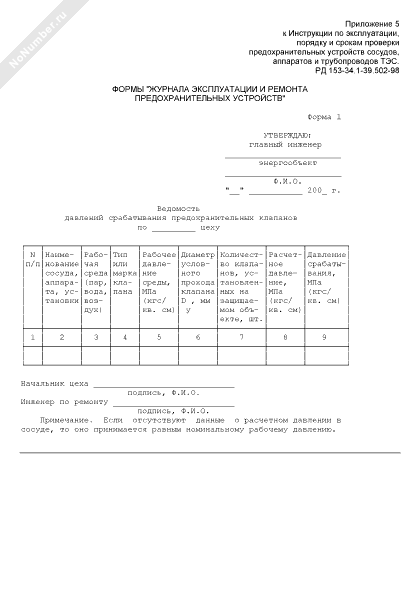 Формы «Журнала эксплуатации и ремонта предохранительных устройств». Ведомость давлений срабатывания предохранительных клапанов сосудов, аппаратов и трубопроводов ТЭС (форма № 1)
