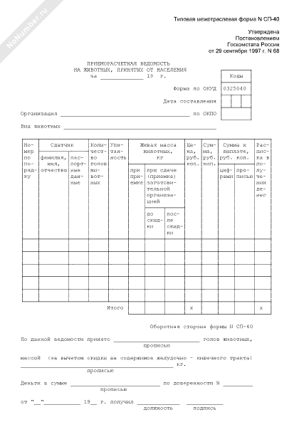 Приемо-расчетная ведомость на животных, принятых от населения (типовая межотраслевая форма № СП-40)