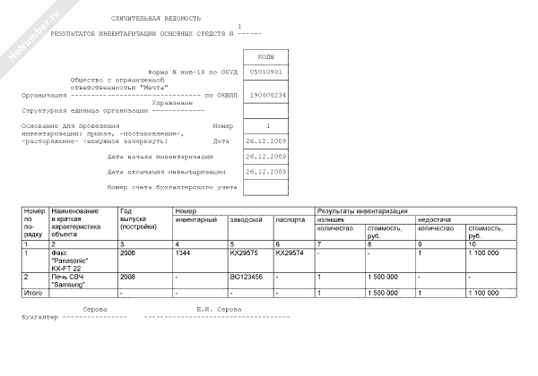 Сличительная ведомость результатов инвентаризации основных средств. Унифицированная форма № ИНВ-18 (рекомендуемый образец заполнения)