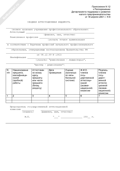 Сводная аттестационная ведомость о присвоении квалификации «Ремесленник — подмастерье», «Мастер — ремесленник» (рекомендуемый образец заполнения)