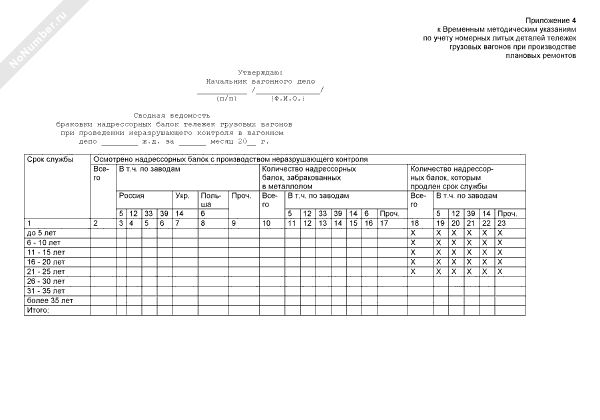 Сводная ведомость браковки надрессорных балок тележек грузовых вагонов при проведении неразрушающего контроля в вагонном депо (рекомендуемый образец заполнения)