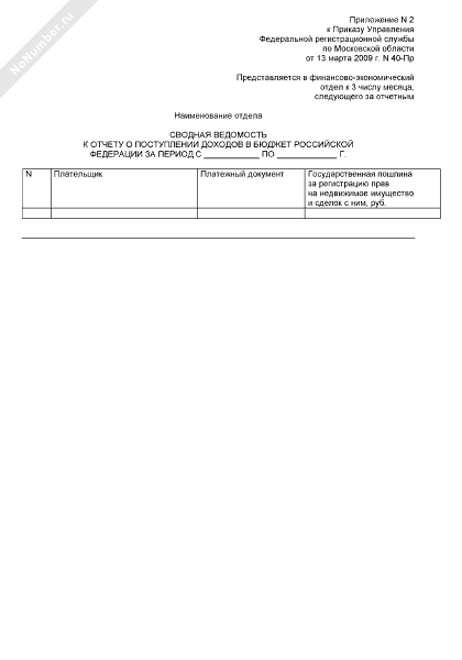 Сводная ведомость к отчету о поступлении доходов в бюджет Российской Федерации от деятельности Управления Федеральной регистрационной службы по Московской области за регистрацию прав на недвижимое имущество и сделок с ним (рекомендуемый образец заполнения)
