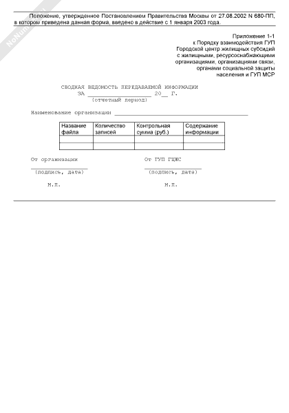 Сводная ведомость передаваемой информации
