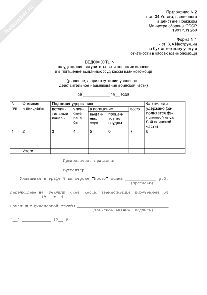 Ведомость на удержание вступительных и членских взносов и в погашение выданных ссуд кассы взаимопомощи при воинской части (форма № 1)