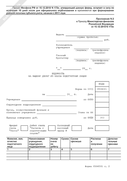 Ведомость на выдачу денег из кассы подотчетным лицам