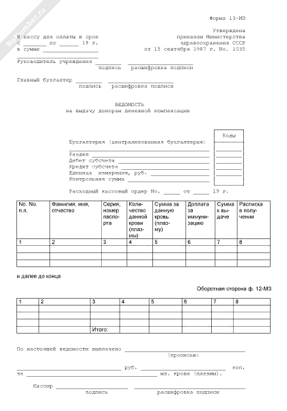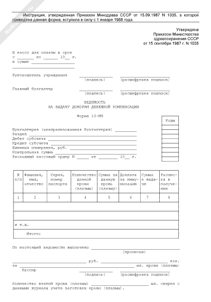 Ведомость на выдачу донорам денежной компенсации. Форма № 13-МЗ