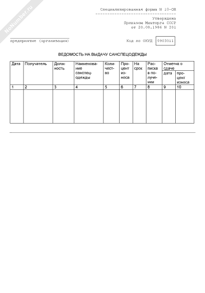 Ведомость на выдачу санспецодежды. Специализированная форма № 10-ОН