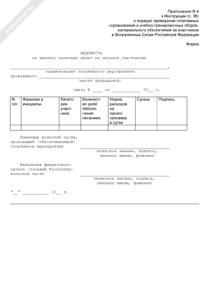 Ведомость на выплату наличных денег на питание участникам соревнований или сборов (рекомендуемый образец заполнения)