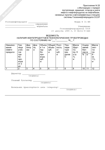 Ведомость наличия нефтепродуктов в технологических трубопроводах. Форма № 31-НП (рекомендуемый образец заполнения)