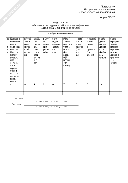 Ведомость объемов проектируемых работ по топографической съемке суши и акваторий на объекте. Форма № ПС-12 (рекомендуемый образец заполнения)
