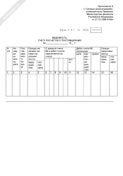 Ведомость учета расчетов с поставщиками. Форма № В-7