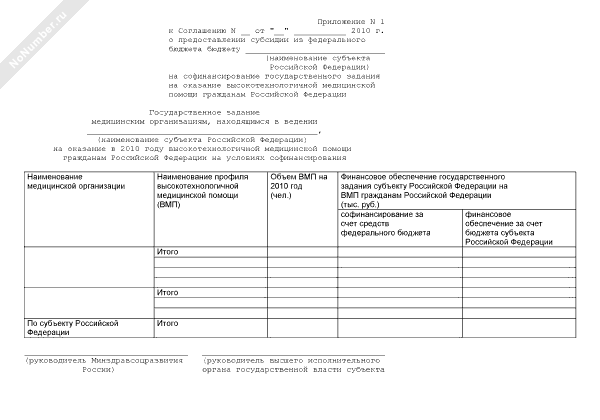 - 2Государственное задание медицинским организациям, находящимся в ведении субъекта Российской Федерации на оказание в 2010 году высокотехнологичной медицинской помощи гражданам Российской Федерации на условиях софинансирования (приложение к соглашению)