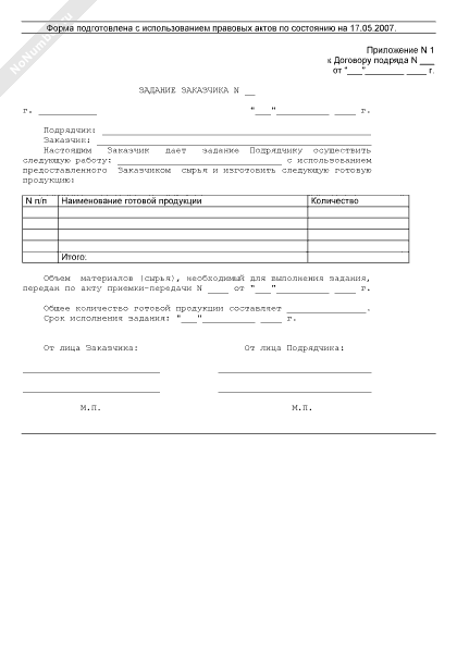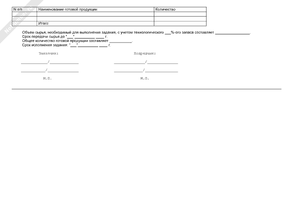 - 7Задание заказчика подрядчику на изготовление готовой продукции с использованием предоставленного заказчиком сырья (приложение к договору подряда на выполнение работ)