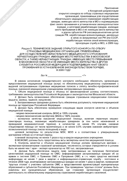 - 110Техническое задание открытого конкурса по отбору страховых медицинских организаций, привлекаемых для осуществления обязательного медицинского страхования неработающих граждан, имеющих место жительства в Московской области, а также неработающих граждан, имеющих место пребывания в Московской области и не имеющих места жительства в других субъектах Российской Федерации и подтвердивших факт своего проживания в установленном законодательством порядке, в 2009 году