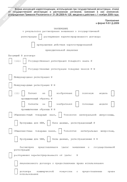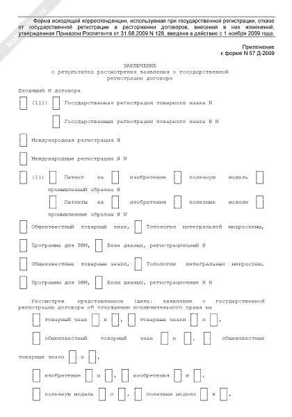 - 214Заключение о результатах рассмотрения заявления о государственной регистрации договора (приложение к уведомлению об отказе в государственной регистрации договора об отчуждении исключительного права в Федеральной службе по интеллектуальной собственности, патентам и товарным знакам. Форма № 57 Д-2009)