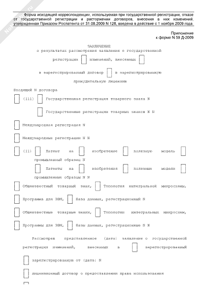 - 215Заключение о результатах рассмотрения заявления о государственной регистрации изменений, внесенных в зарегистрированный договор (в зарегистрированную принудительную лицензию) (приложение к уведомлению об отказе в государственной регистрации изменений, внесенных в договор в Федеральной службе по интеллектуальной собственности, патентам и товарным знакам. Форма № 59 Д-2009)