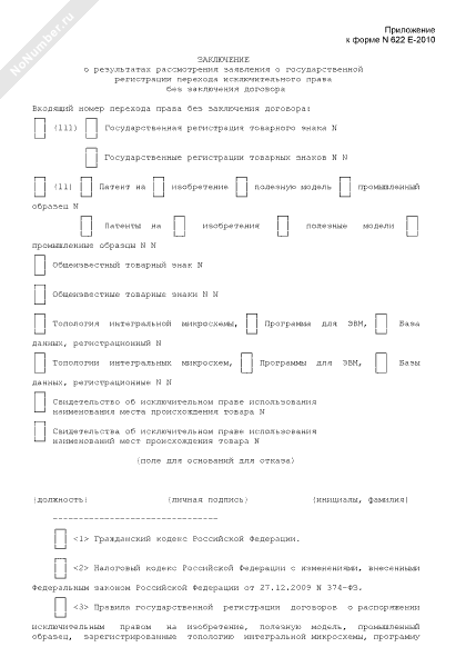 - 218Заключение о результатах рассмотрения заявления о государственной регистрации перехода исключительного права без заключения договора (приложение к форме № 622 Е-2010)