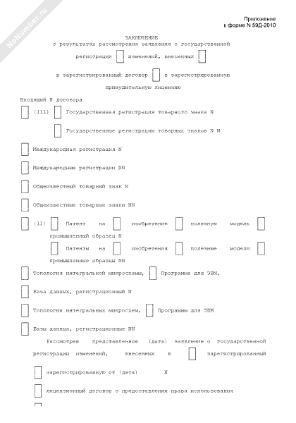 - 219Заключение о результатах рассмотрения заявления о государственной регистрации изменений, внесенных в зарегистрированный договор в зарегистрированную принудительную лицензию (приложение к форме № 59Д-2010)