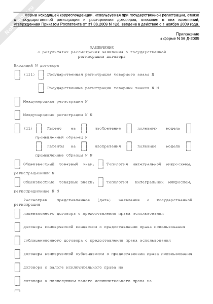 - 213Заключение о результатах рассмотрения заявления о государственной регистрации договора (приложение к уведомлению об отказе в государственной регистрации договора в Федеральной службе по интеллектуальной собственности, патентам и товарным знакам. Форма № 56 Д-2009)
