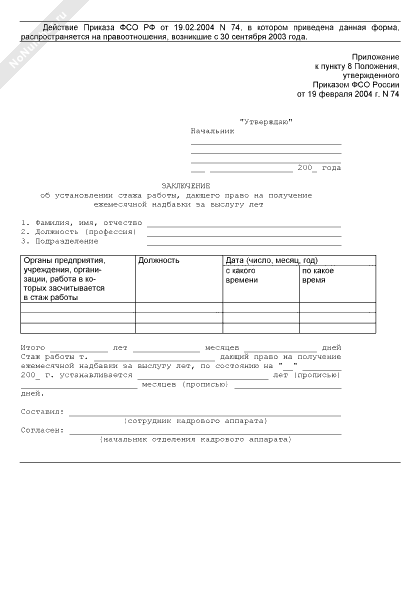 - 274Заключение об установлении стажа работы, дающего право на получение ежемесячной надбавки за выслугу лет