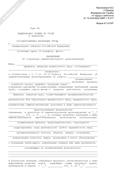 - 271Заключение об устранении административного правонарушения. Форма № 13-ГИТ
