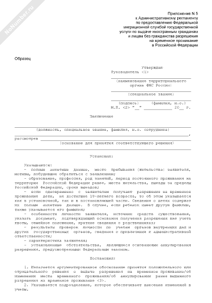 - 325Заключение по решению о выдаче или об отказе в выдаче разрешения на временное проживание в Российской Федерации