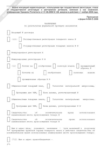 - 329Заключение по результатам формальной проверки документов (приложение к уведомлению об отказе в принятии заявления к рассмотрению в Федеральной службе по интеллектуальной собственности, патентам и товарным знакам. Форма № 600 Е-2009)