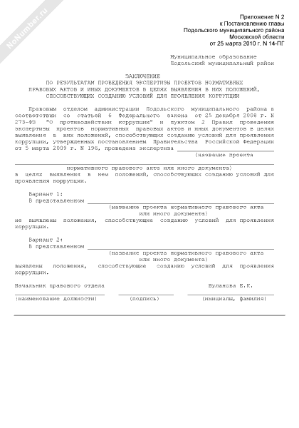 - 324Заключение по результатам проведения экспертизы проектов нормативных правовых актов Подольского муниципального района Московской области и иных документов в целях выявления в них положений, способствующих созданию условий для проявления коррупции