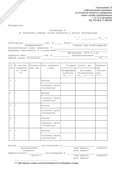 - 429Рекомендуемые формы бланков для оформления материалов по контролю технического состояния. Заключение по измерению толщины стенки тройников и врезок трубопровода