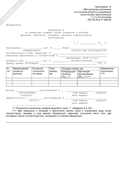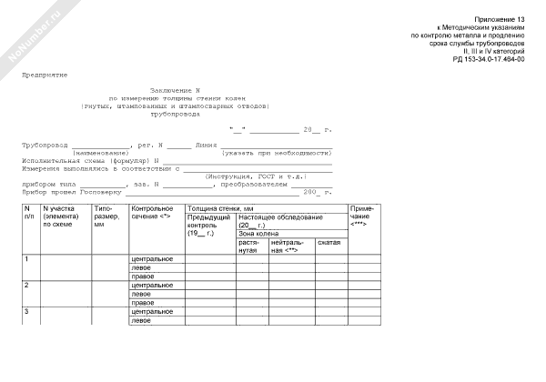 - 423Рекомендуемые формы бланков для оформления материалов по контролю технического состояния трубопровода. Заключение по измерению толщины стенки элементов и деталей (фланцев, переходов, заглушек, линзовых компенсаторов) трубопровода